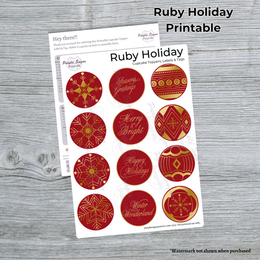 Ruby Holiday Cupcake Toppers, Labels or Gift Tags P.D.F. Printable Party Decor